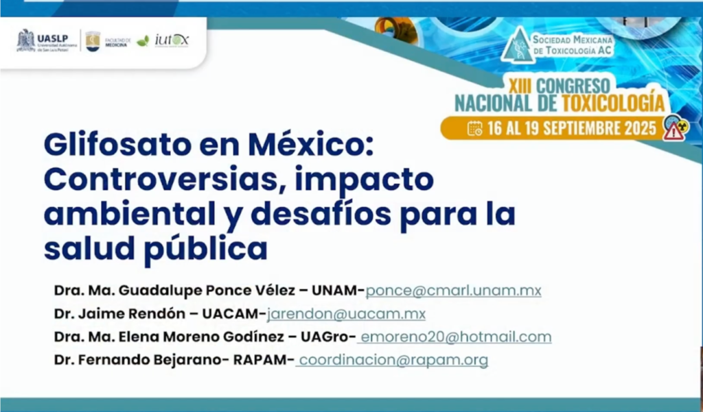 Panel sobre el Glifosato en México desde una perspectiva crítica multidisciplinaria, realizado el 19 de septiembre en San Luis Potosí, durante el XIII Congreso Nacional de Toxicología de 1 hora 22 minutos de duración con comentarios del público.
